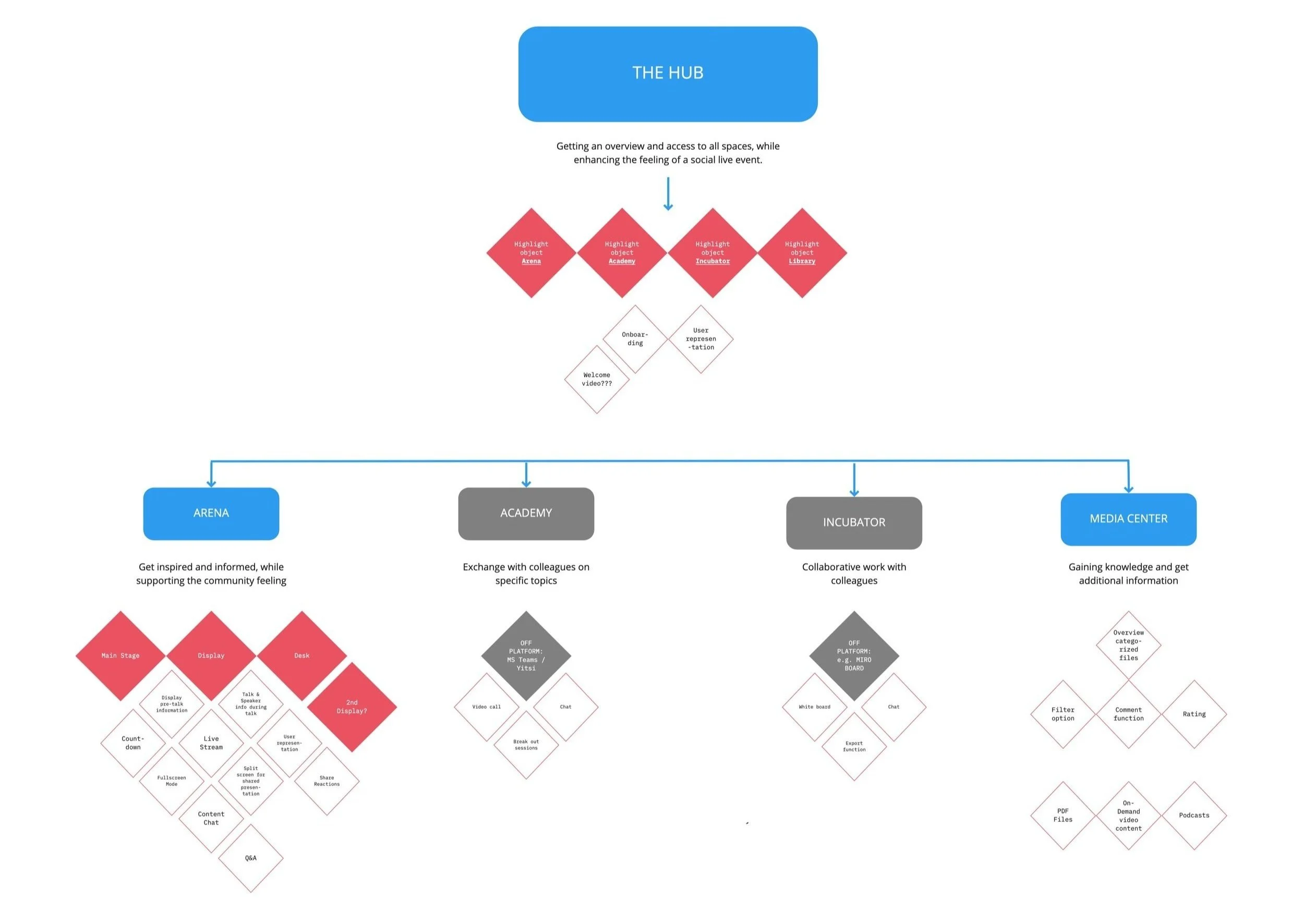 Hub View: Initially users are located in the so-called hub view to gain a perfect overview of the platform and its virtual spaces.
